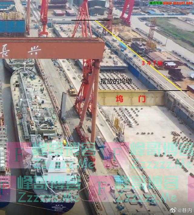 从四月份的图片来看4#船坞已经腾空,开始摆放坞墩。黄色的坞间隔板将船坞分成里外两段,从隔板到坞首有340多米,足够搭建003。而且这道坞间隔板只能安装在那里,因为下面有基座,放在别的地方无法固定,不能密封。