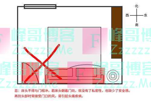 床头朝向切忌朝西,以现代科学来解释,因为地球是由西向东自转的,头若朝西或朝东入睡,血液就会经常向头顶直冲,那么睡眠就会很不安稳,睡眠质量也会很差,长期下来人就会变得很没有精神了。