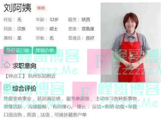 看了她的简历,有网友说她是“最牛保姆”,但更多人开始质疑:如果辛辛苦苦读个硕士,出来却做保姆,那读书还有什么用?小学毕业就去做不就行了?但是您请往下想。这位“阿姨”,懂早教、会英语法语、有知识有阅历,她跟普通阿姨能一样吗?其实人家在保姆培训期间,就有客户开出了2万月薪,而且还有很多雇主在竞价,成为了家政行业的“顶流”。
