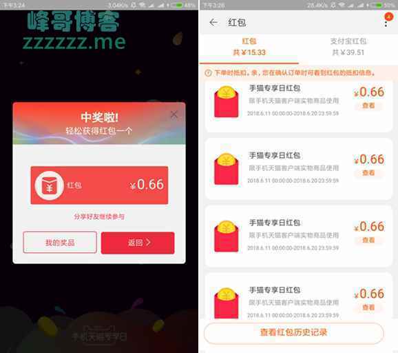 手机淘宝&天猫都可以参与活动,反复领取5次每次必中0.66元红包!