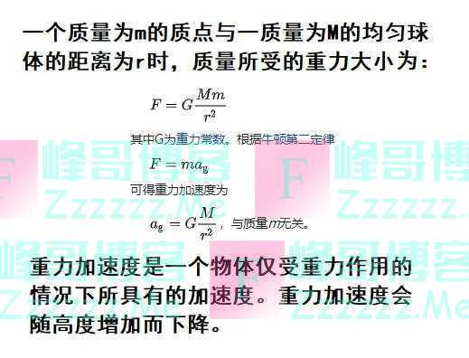 其实两者没有半毛钱关系,从上图公式中我们可以发现,重力加速度只和天体的质量与距离有关,只要距离再远一点,重力加速度就会小于9.8米/秒,甚至更小,但永远都不会变成零!不过这个重力加速度即使在地球上也会受到各种影响而出现变化!
