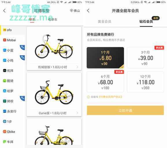 免押金骑所有单车!一月只要6.8,只需件缴纳一6.8元即可使用多种品牌共享单车,让每个人随时随地有车骑