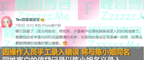 在7月8日的那天,银行终于给出了答复,说是因为性别一样名字也一样,所以银行搞错人了。对于这样的答案,女子显然不认同不接受。搞错人,这可能吗?银行这样的地方,大家去办理什么业务都要携带身份证,每个人的身份号码也完全不同,系统真的这么容易出错吗?另外,女子在8年前就已经注销掉了建行的卡。