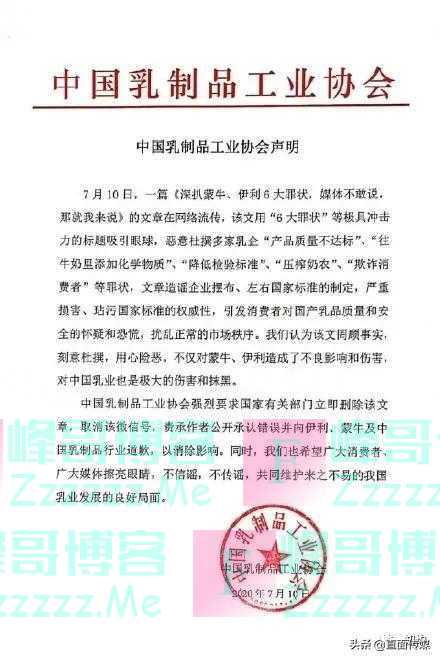 据悉,《深扒蒙牛伊利六大罪状,媒体不敢说,那就我来说》刊发后,中国乳制品工业协会立即代表乳业进行了回击。