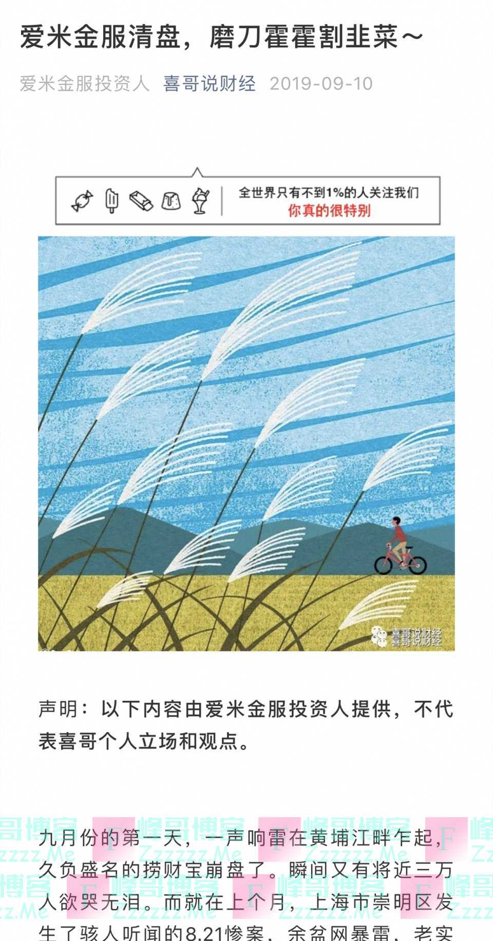 2019年9月10日,微信公众号“喜哥说财经”发表了一篇标题为《爱米金服清盘,磨刀霍霍割韭菜~》文章,揭开了爱米金服的真面目。根据该篇文章的声明,为这篇文章提供素材内容的,是爱米金服投资人,而文章作者也标注为:爱米金服投资人。