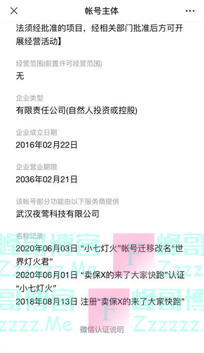 从账号“世界灯火君”的账号主体信息可以发现,这个账号于2018年8月13日注册,名称为“卖保X的来了大家快跑”,2020年6月1日,认证为“小七灯火”,2020年6月3日,“小七灯火”账号迁移改名“世界灯火君”。