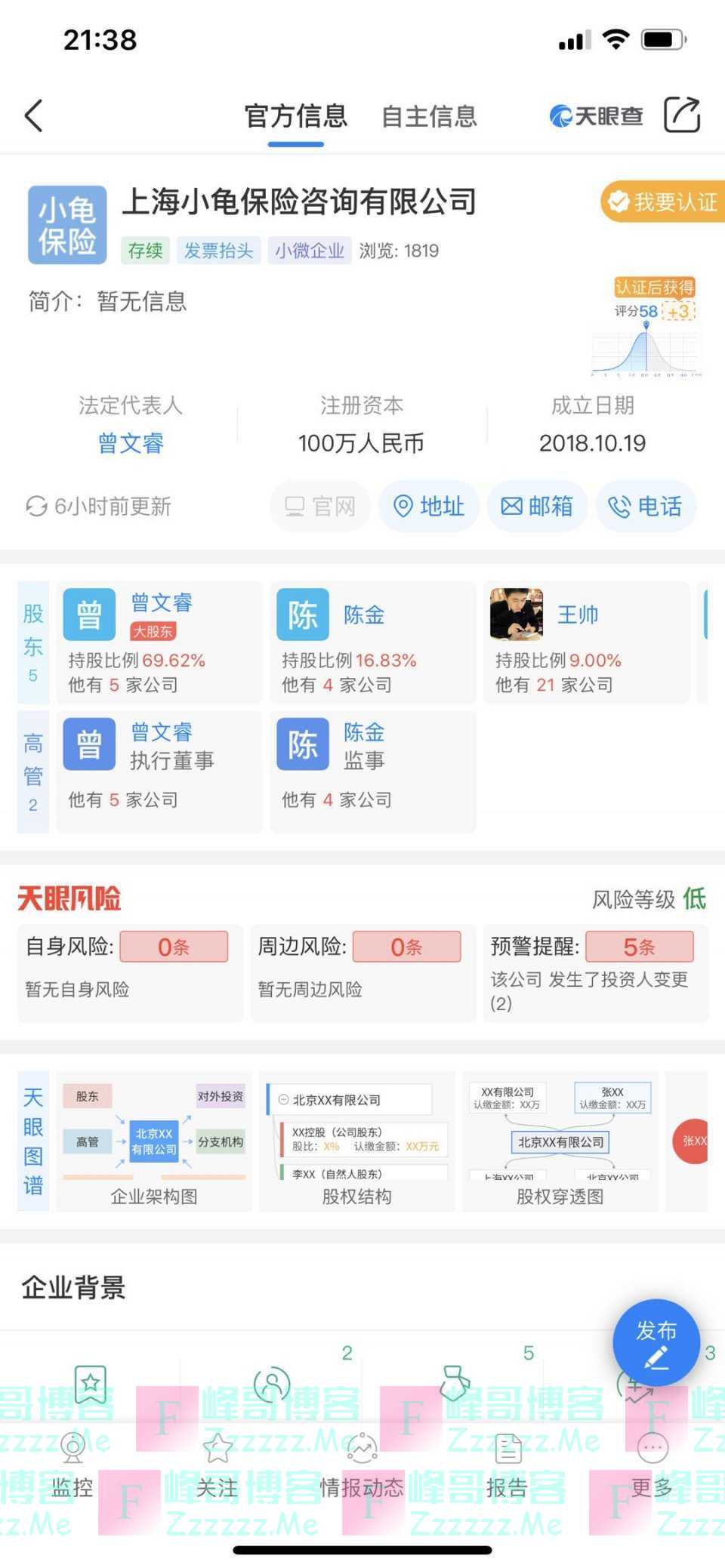 此次发布文章的微信公众号“世界灯火君”也并非王帅本人的账号,其注册主体为上海肯歌互联网科技有限公司,成立时间为2016年2月22日,由上海小龟保险咨询有限公司100%持股,而王帅正是小龟保险的股东之一。