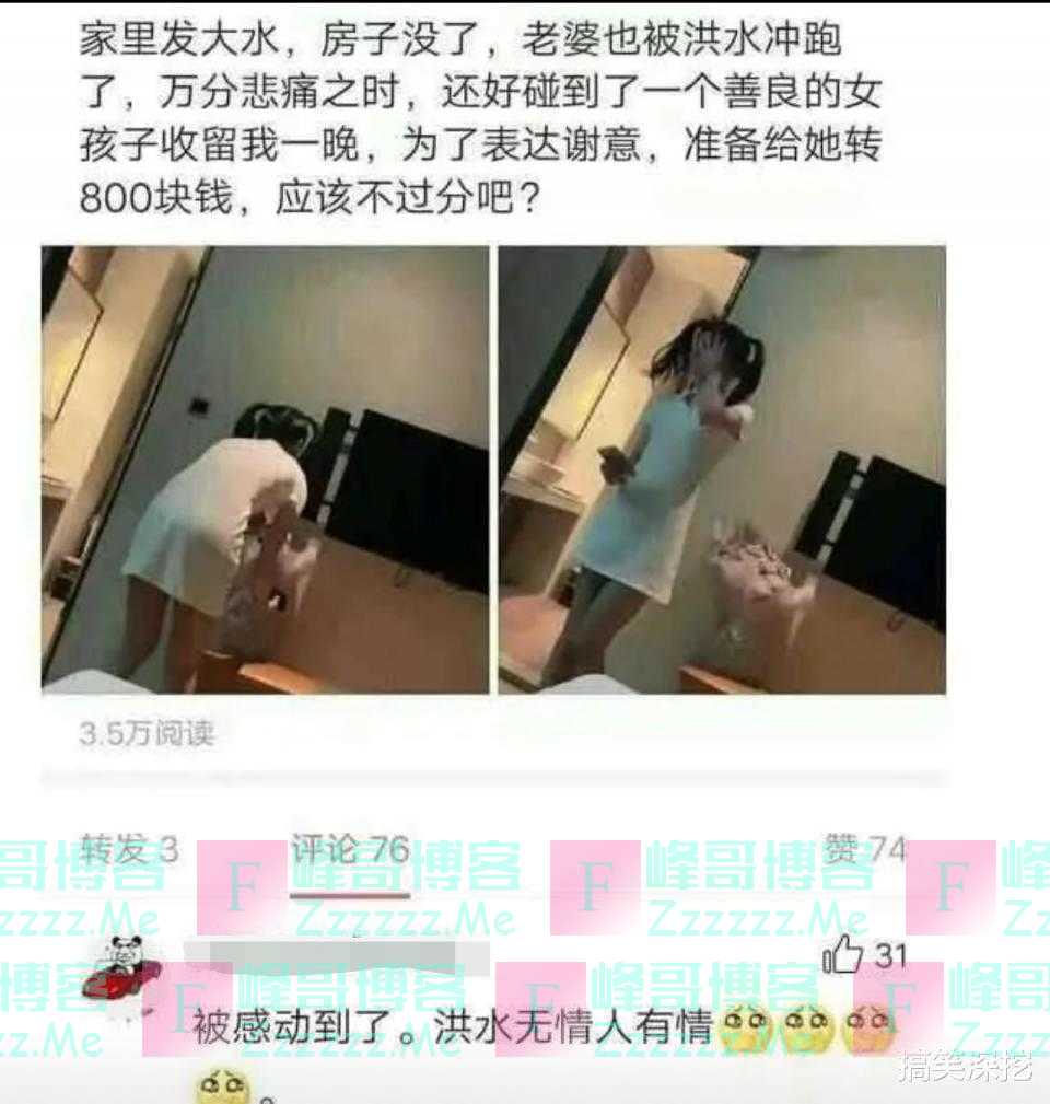 家里发大水了,房子没有了,老婆也被洪水冲泡了,于是自己十分的悲痛,还好被一个善良的女孩子收留了我一晚,真的是太感动了!哈哈哈,现在的人呀,这样的事情都说得那么的脱俗了,大家都是知道你做的什么事情,真的是太无情了,有什么事情还是和警察叔叔说吧~