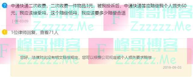 有不少网友在网上诉苦:“湖南某乡镇到处取件收取快递费,没人管,1次5元”,“乡下收费都要3-5元左右,不然说只到县城,到不了乡下”,其实是颇为无奈的。有消费者在一个法律援助网站上问:××快递二次收费,二次收费一件物品3元,被我投诉后,××快递答应赔偿我个人损失60元,我应该接受吗,这个赔偿低吗,我应该要多少赔偿合适?一位律师答:法律对此没有明文赔偿规定,您可以根据公司规定或个人损失要求赔偿。