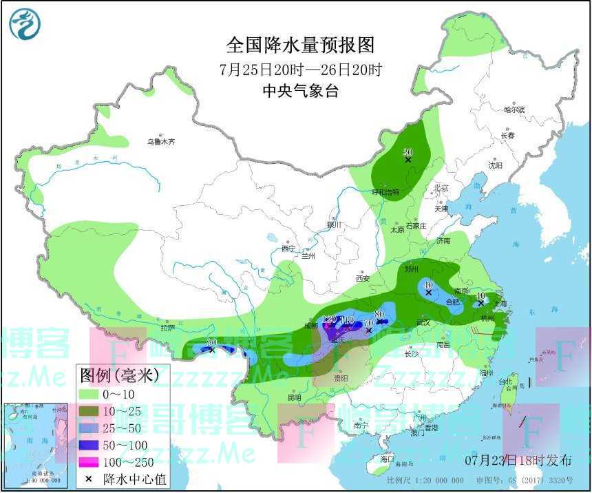 从基础情况来看,分散性的大雨在四川偏多,而暴雨或大暴雨是横跨多个省份,到l7月25日,强降雨会再次升级,其中四川基本包了所有的强降雨地带,我们可以明显看到,四川盆地西部的强降雨地带是非常多的,当然综合情况来说,分散性的强降雨是集中在陕西西南部、四川盆地西部、安徽南部、浙江中部等地部分区域。
