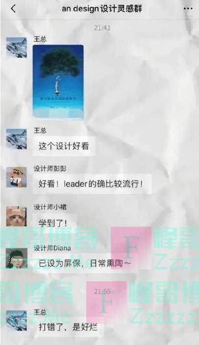 公司群里面总有一些莫名其妙的马屁精,这下可好,你们的马屁拍错了。哈哈哈!有拍马屁的这个功夫还不如用在别的地方上,也不知道这位王总是不是故意的,这套路挺深的啊,刚开始说这设计好看,几位设计师瞬间跟风,然后又说打错了是好烂,这几位设计师有瞬间改变了话风,真是强中自有强中手,一山还比一山高啊!