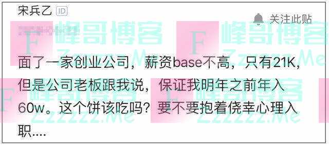 该网友发帖称:“面了一家创业公司,薪资base不高,只有21K,但是公司老板跟我说,保证我明年之前年入60w。这个饼该吃吗?要不要抱着侥幸心理入职....”
