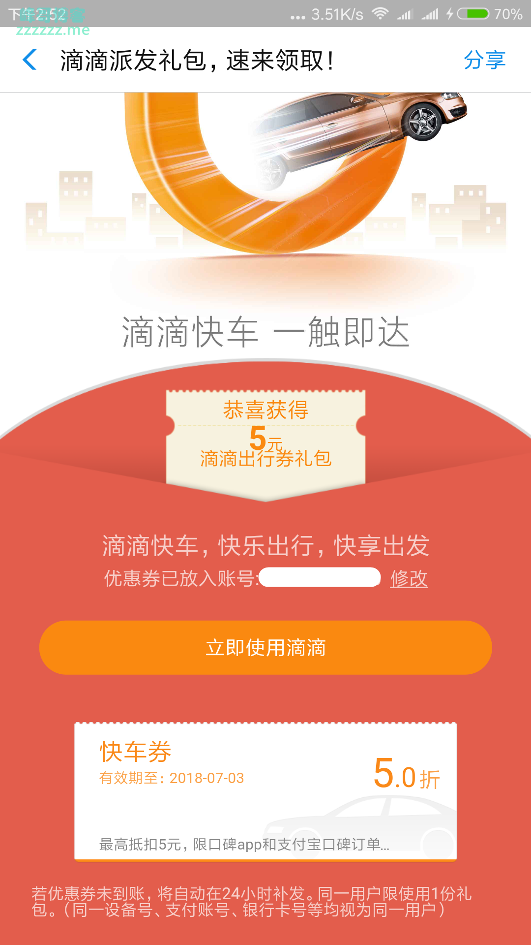 支付宝活动领取滴滴快车5折优惠券》发布于2018-6-26