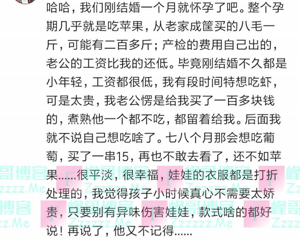 我2004年结婚,当时和老公办完酒席只乘下两千多块,接着怀了四个多月的孩子,晚上老公带上怀四个月孕的我散步,街道边摆满了水果,我老公牵着我问想吃什么水果?我想想我们的存款,吞吞口水摇头说:“啥都不想吃。”老公似乎看出我的不舍,硬着买了两个梨给我,我说我们一起吃一人一个才香,老公接着笑咪咪拿他那个叫我多啃几口,说他刚吃完饭吃一个太饱。幸亏我们这边没有彩礼这个说法,不然我老公肯定取不起老婆。