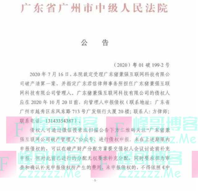 2020年7月16日,广州中院已裁定受理广东猪兼强互联网科技有限公司破产清算一案,呼吁债权人关注自身的权益,积极申报债权。