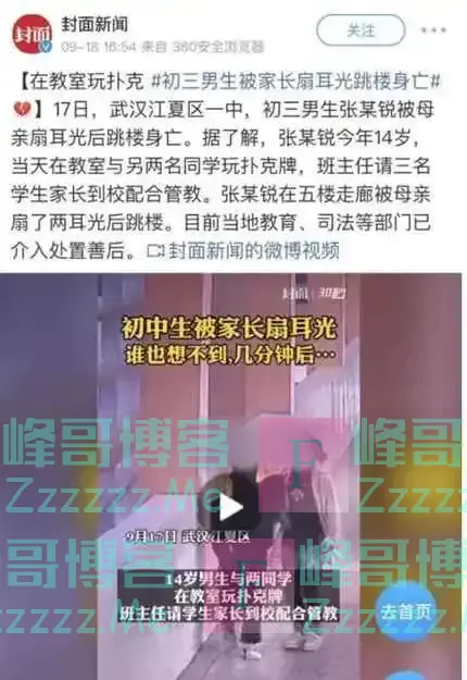 湖北武汉一位14 岁男生被母亲打耳光后跳楼坠亡。