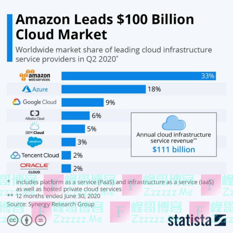 现如今,云计算平台中,亚马逊、微软、谷歌分别以33%,18%,9%的市占率构成了第一梯队,阿里云则凭借着强大的中国市场以6%的成绩紧随其后。