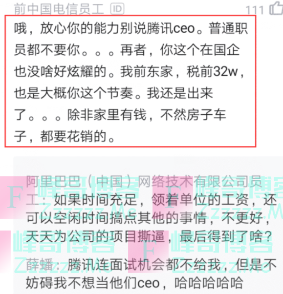 也有的网友说腾讯普通员工你都当不了,在国企又有什么好秀的呢?自己之前在的国企税前32万,工作也很轻松,这不是最后还是辞职了。除非家里条件还不错,不然房贷车贷就够你喝一壶了。