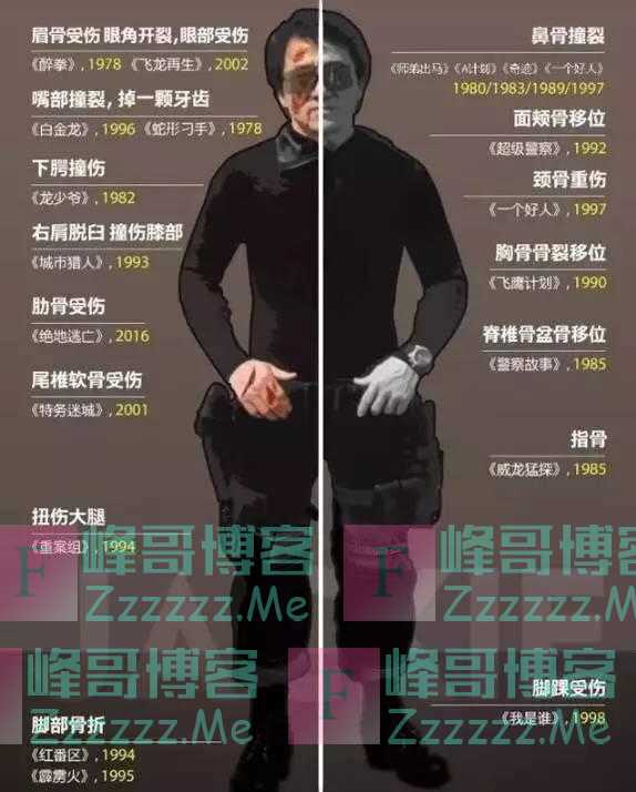 纵观成龙的演艺生涯,受伤的部位从头到脚多达十几处,脸部是受伤最多的地方,其中鼻梁就受伤4次,摔晕过去更是家常便饭。可即便是这样,成龙依旧每部戏亲自上阵,用自己的拼命获得了影迷和业内电影人的尊重。