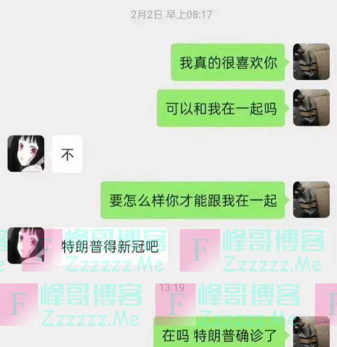 年初的时候我跟暗恋的女神告白,女神告诉我什么时候特朗普能得新冠肺炎就会选择跟我在一起,你们看连上帝都听到了我的呼喊声,你们说妹子还能选择跟我在一起吗,做人可要信守承诺呀,特朗普感觉有被冒犯到,哈哈哈没有什么能比他更懂新冠了。