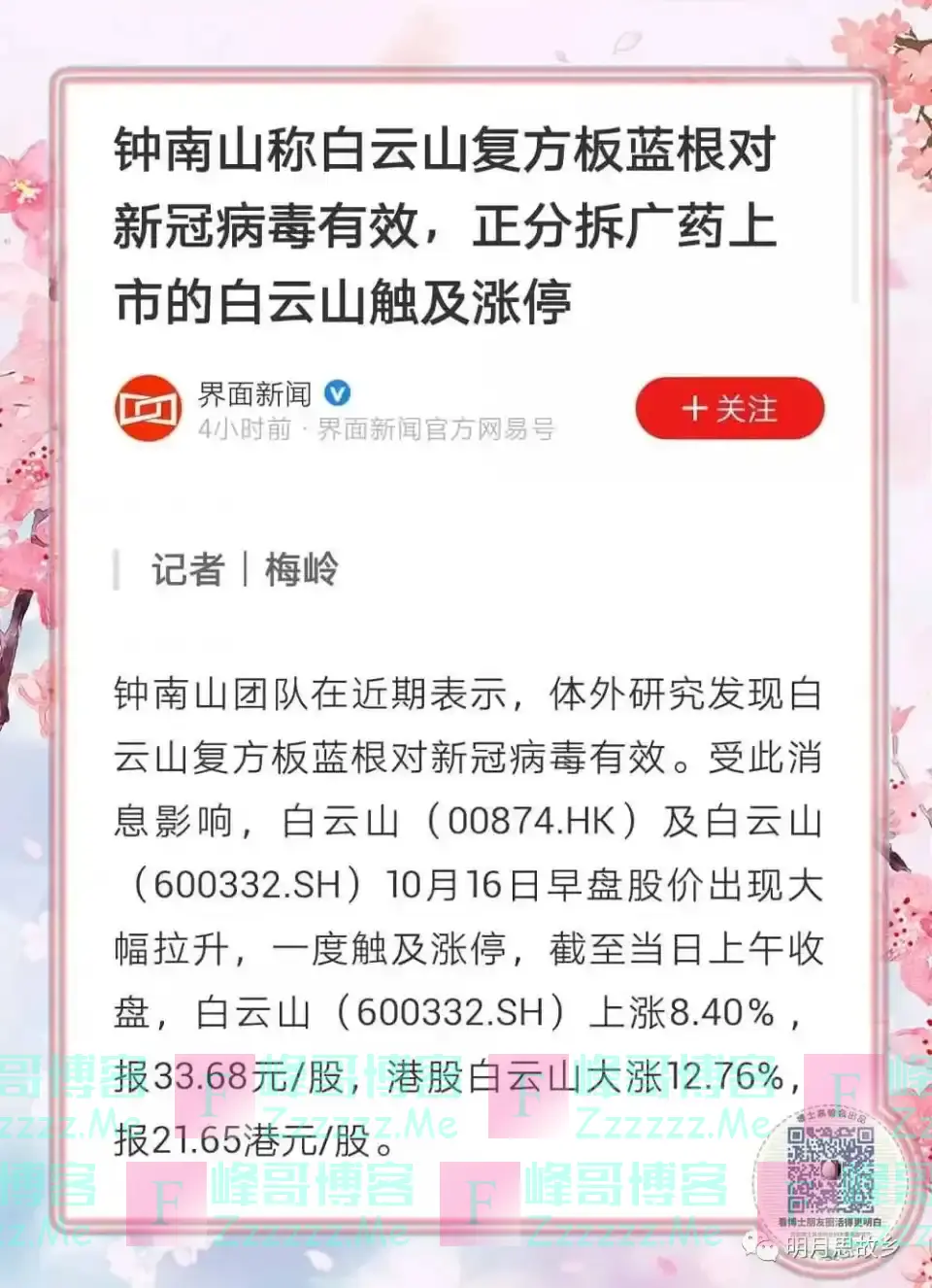 当天,总部位于广东的白云山A股涨停,港股更是上涨超过12%,两者一天就为白云山增加了上百亿市值。