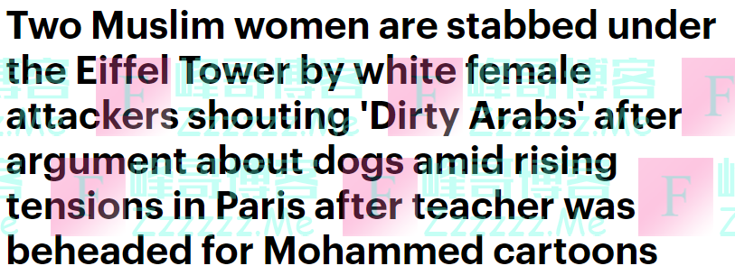 在周日晚上,埃菲尔铁塔下,两名穆斯林的妇女被法国白人女子用刺刀反复刺伤,行凶者嘴里甚至还喊着:肮脏的阿拉伯人,滚回你们自己的国家。