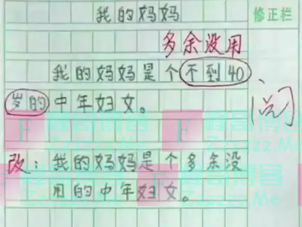 作文内容非常的简单,只有一句话:“我的妈妈是个不到40岁的中年妇女。”