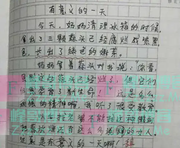 同样是“妈见打”系列,有0分作文,必然有高分作文的存在。比如这篇《有意义的一天》。在语言的描述上通顺、舒服,用词也很准确,转折部分却让人大跌眼镜。