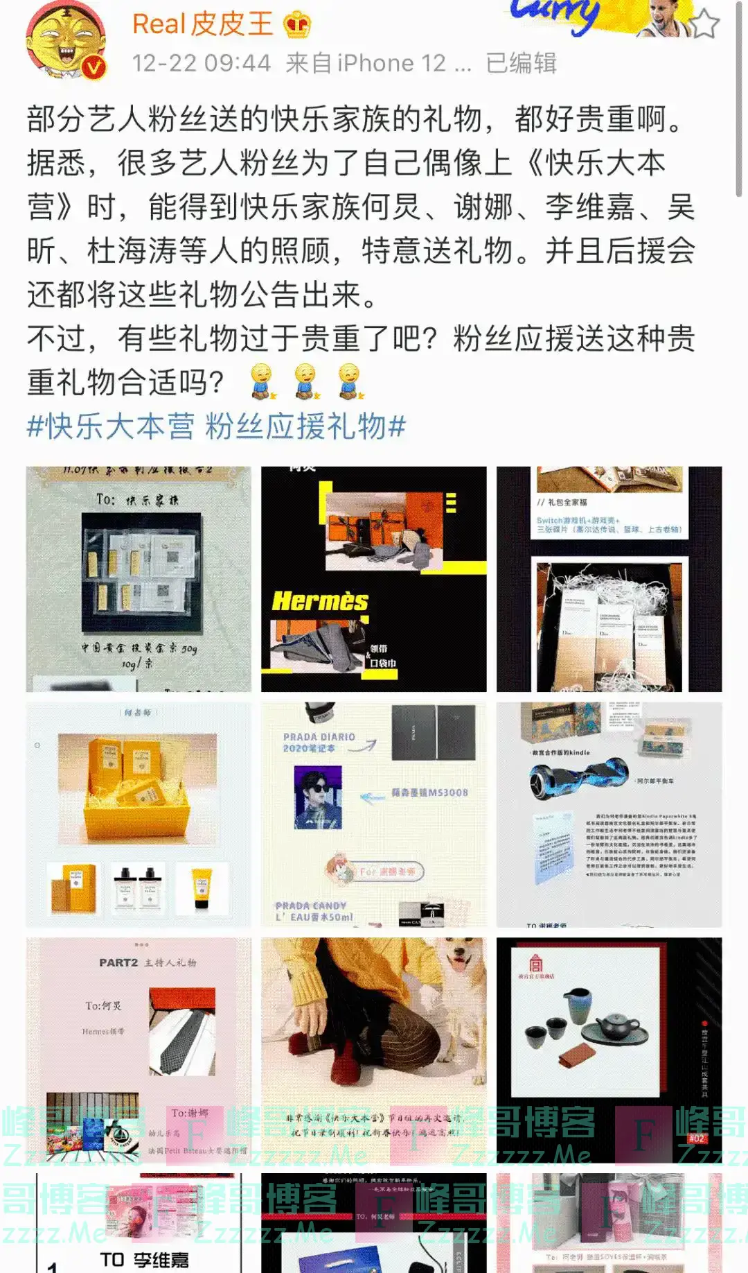 有网友列举了各家粉丝在《快乐大本营》录制期间,给快乐家族几位主持人送的应援礼,其中 不乏奢侈品牌,也有电子书、婴儿套装等专门为不同主持人量身选择的礼物。