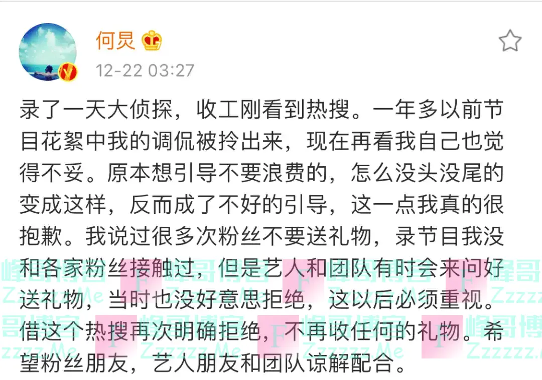 △12月22日凌晨,何炅微博回应粉丝送礼一事