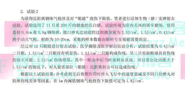 他们以猪为实验对象,在距离10—20厘米的距离内用气枪使用直径0.6cm、重0.9克的钢珠弹射击猪眼得出,枪口比动能在大于等于1.8焦耳/厘米时会对眼睛造成伤害。之后,公安部将此数据设定为枪支致伤力的鉴定标准。