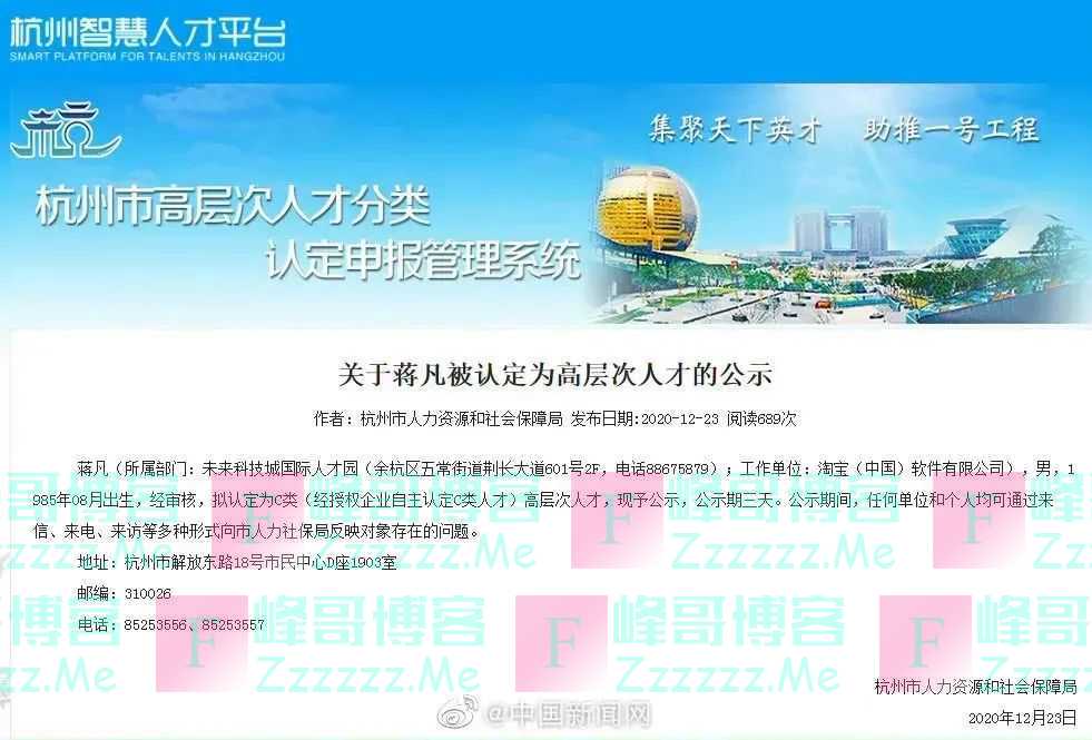 12月24日,一条名为“蒋凡被认定为杭州高层次人才”的话题冲上热搜!