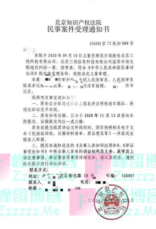 北京知识产权法院民事案件受理通知书(2020)京73民初888号显示,王某诉被告北京三快科技有限公司、北京三快信息科技有限公司滥用市场支配地位纠纷案,经审查,符合《中华人民共和国民事诉讼法》规定的受理条件,北京知识产权法院决定立案审理。落款时间为2020年10月29日。
