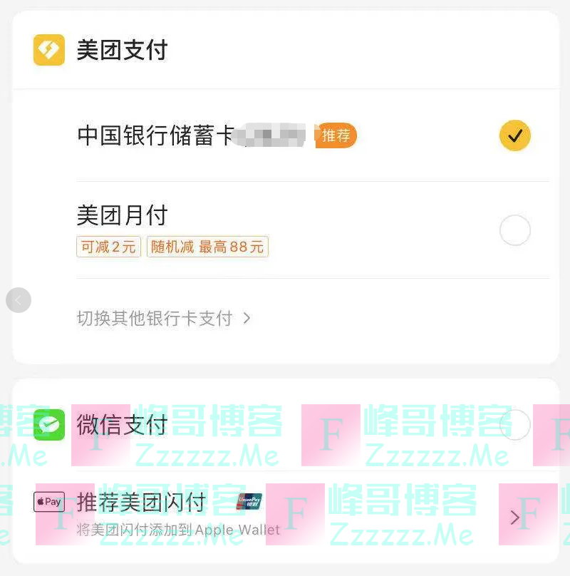 据悉,利用安卓手机在美团APP下单后,有银行卡支付、美团月付、微信支付、支付宝支付,这几种支付方式,而支付宝支付方式被折叠。而据部分苹果手机用户反映,自己使用美团APP下单时候,只有银行卡支付、美团月付、微信支付以及Apple Pay这几种支付方式,从来没有支付宝支付。