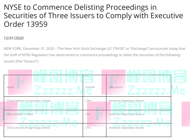今日下午,商务部网站文章称,美东时间12月31日,美国纽约证券交易所发布新闻稿,宣布将启动程序,把中国电信股份有限公司、中国移动有限公司、中国联通(香港)有限公司等三家中国企业从纽交所“摘牌”。