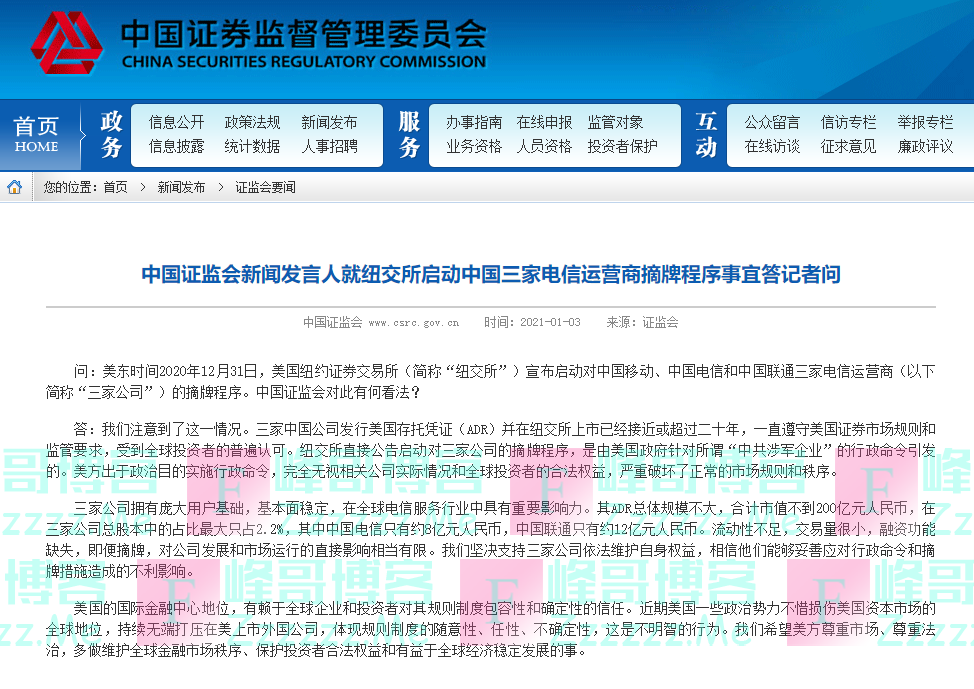 就纽交所宣布启动对我国三大运营商的摘牌程序,中国证监会也做出了回应。1月3日,中国证监会新闻发言人就纽交所启动中国三家电信运营商摘牌程序事宜答记者问。