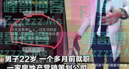 据悉,该男子一个多月前就职一家房地产营销策划公司,日前,该公司的一名管理者通知全体员工下班后到某同事参加同事生日会。