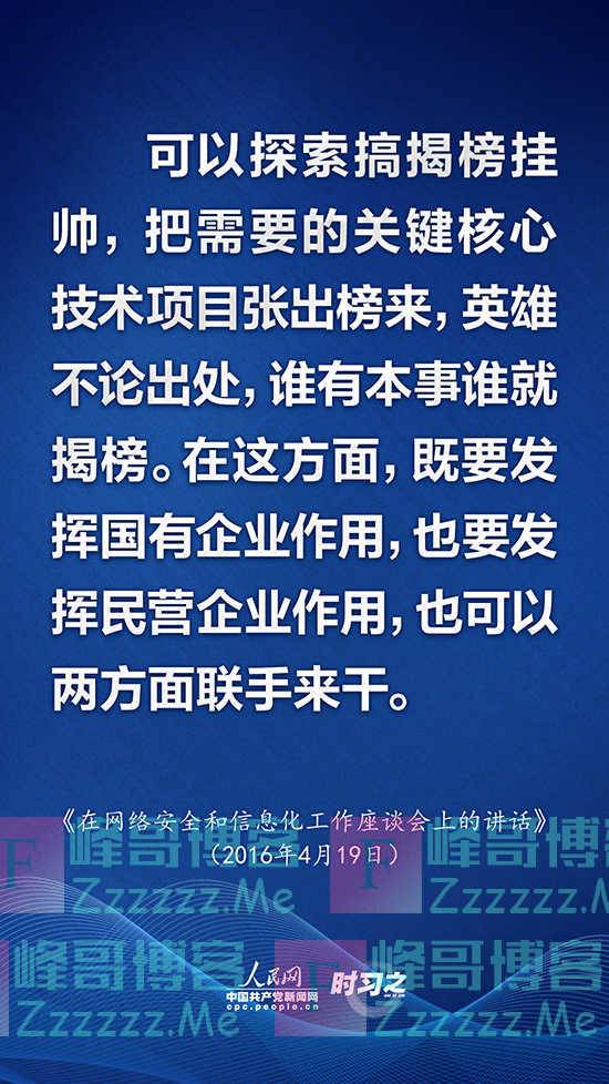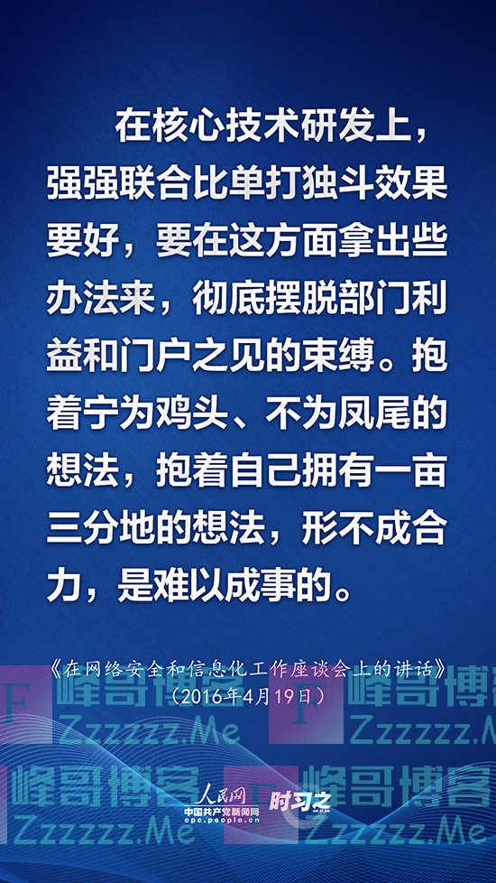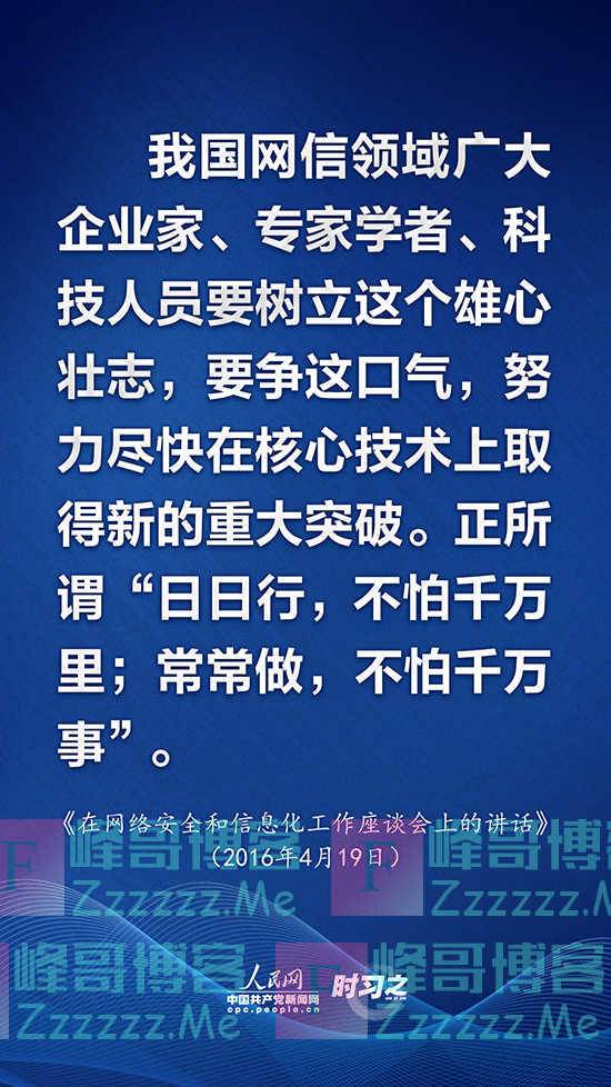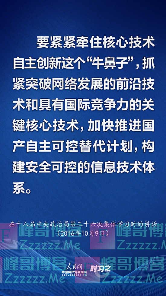 党的十八大以来,以习近平同志为核心的党中央从进行具有许多新的历史特点的伟大斗争出发,重视互联网、发展互联网、治理互联网,统筹协调涉及政治、经济、文化、社会、军事等领域网络安全和信息化重大问题,作出一系列重大决策、实施一系列重大举措,推动我国网信事业取得历史性成就,走出一条中国特色治网之道。人民网·中国共产党新闻网“时习之”栏目梳理了《习近平关于网络强国论述摘编》中有关“加速推动信息领域核心技术突破”的10句金句,与您共同学习。