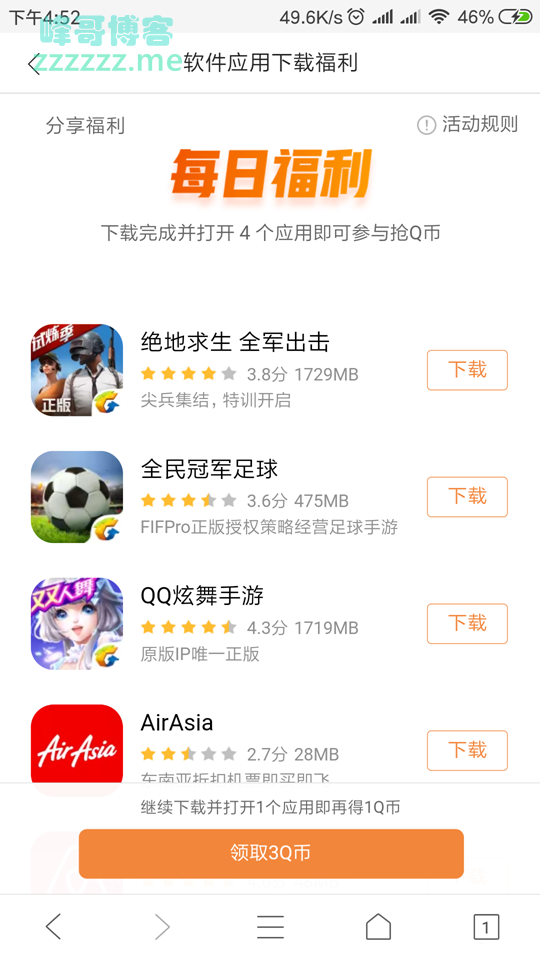 QQ浏览器打开,下载四个应用并打开即可获得1QB,每天限领3QB秒到账!