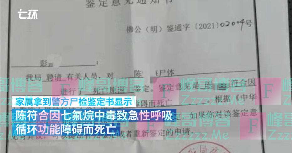 据死者亲属拿到的警方尸检鉴定书显示,陈某梅符合因七氟烷中毒致急性呼吸、循环功能障碍而死亡。警方将以过失致人死亡案侦查。