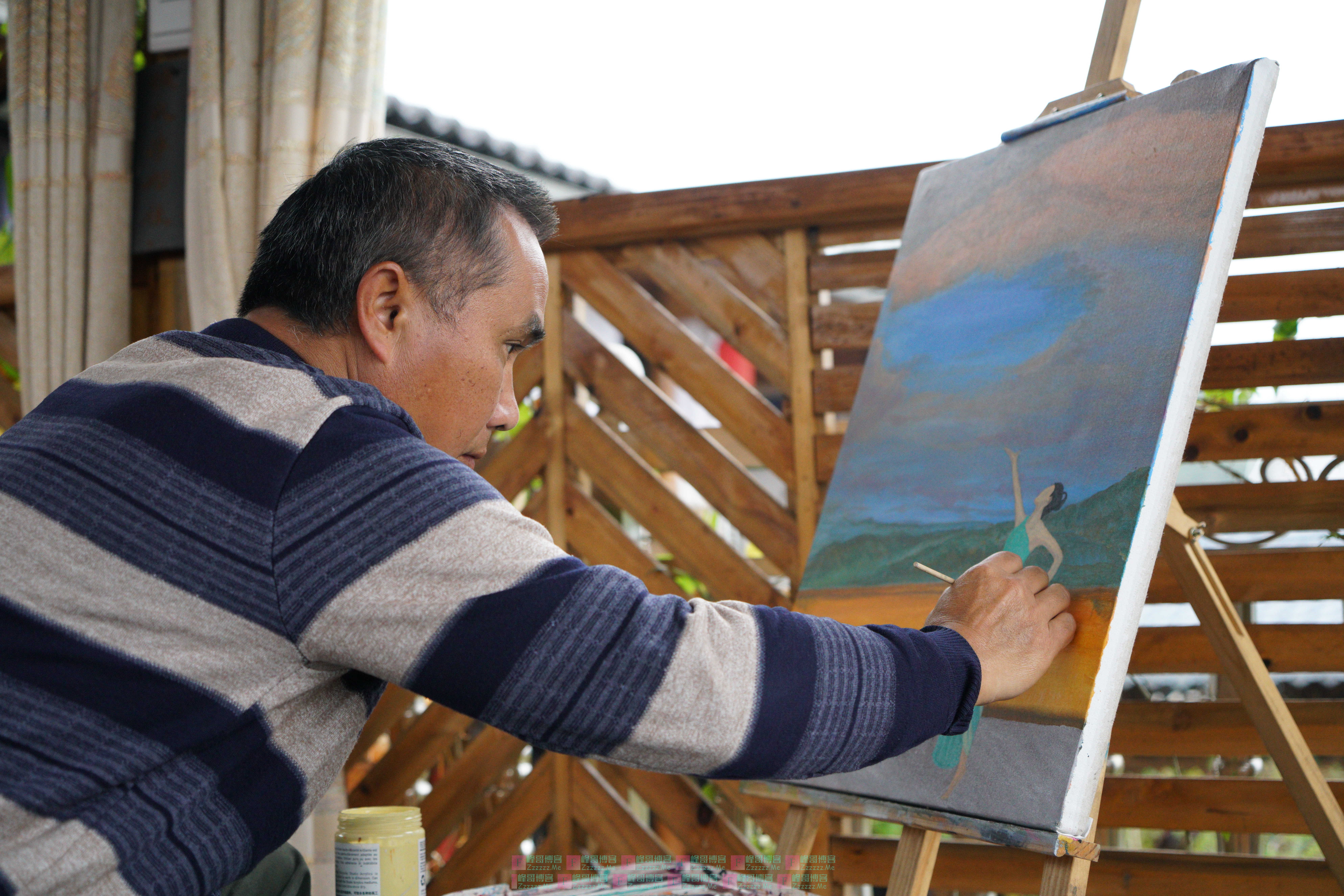 说来也巧,艺术家们刚入驻帕连时,就住在杨正斌的民宿中。“当时他们在院子里画画、创作的时候,我就站在边上看。”杨正斌说,没过多久,他就忍不住自己买了颜料、画布开始学着画画。