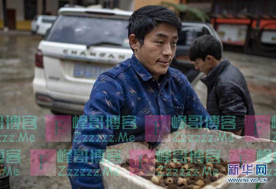 云南贡山县独龙江乡龙元村“致富能手”和晓永在乡里卖羊肚菌(2019年4月19日摄)。新华社记者 江文耀 摄