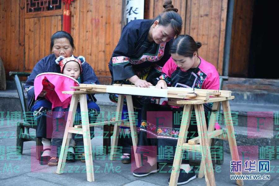 施林娇(右一)在十八洞村学习苗绣(2020年4月25日摄)。新华社记者 薛宇舸 摄