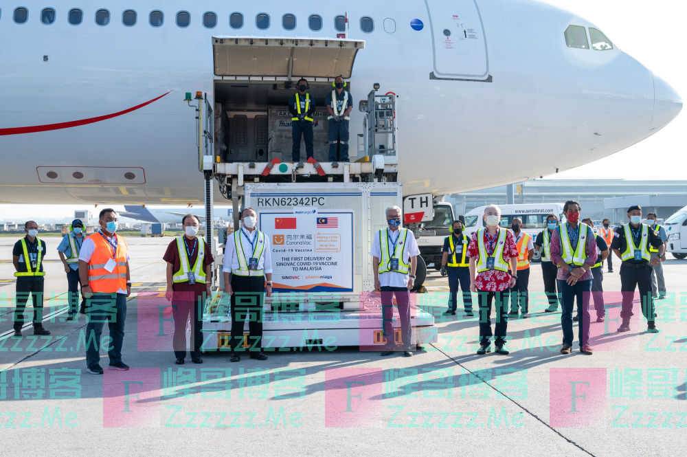 ↑ 2月27日,马来西亚向中国科兴公司订购的首批新冠疫苗半成品运抵吉隆坡,马来西亚四位部长到机场迎接疫苗的到来。