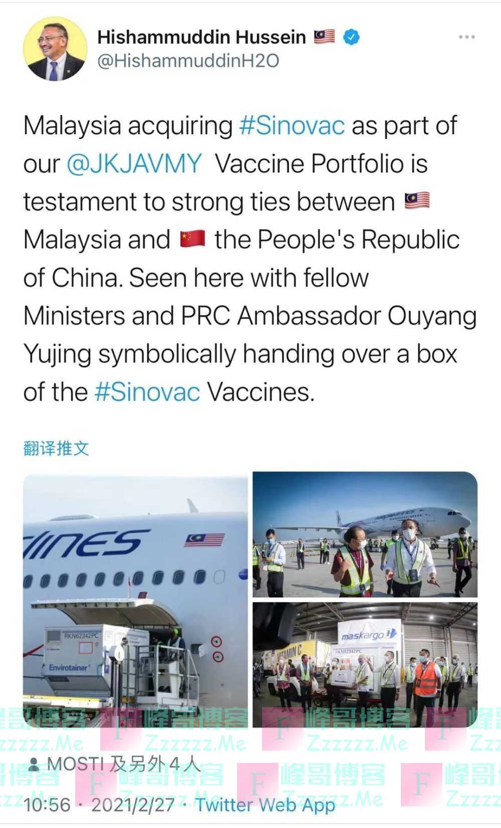 ↑ 马来西亚外交部长希沙姆丁随后在社交媒体上表示,此次疫苗交接意味着马来西亚与中国关系紧密。