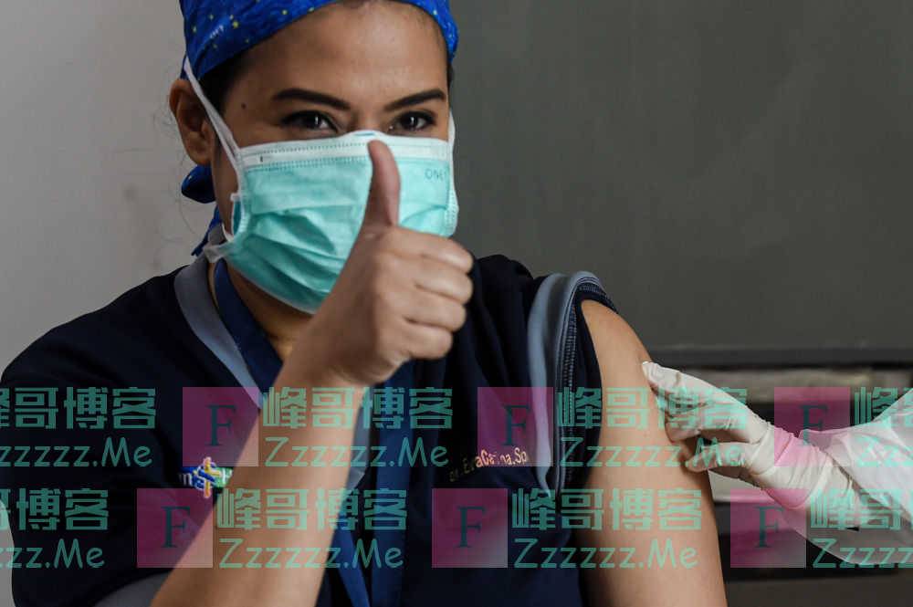 ↑ 一名医务工作者接种中国科兴公司的克尔来福新冠疫苗后竖起大拇指。