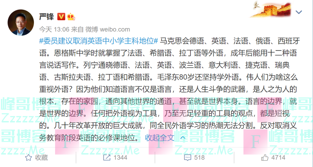 复旦大学中文系教授严锋表示:“任何把外语视为工具,乃至无足轻重的工具的观点,都是短视的。几十年改革开放的巨大成就,同全民外语学习的热潮无法分割。”