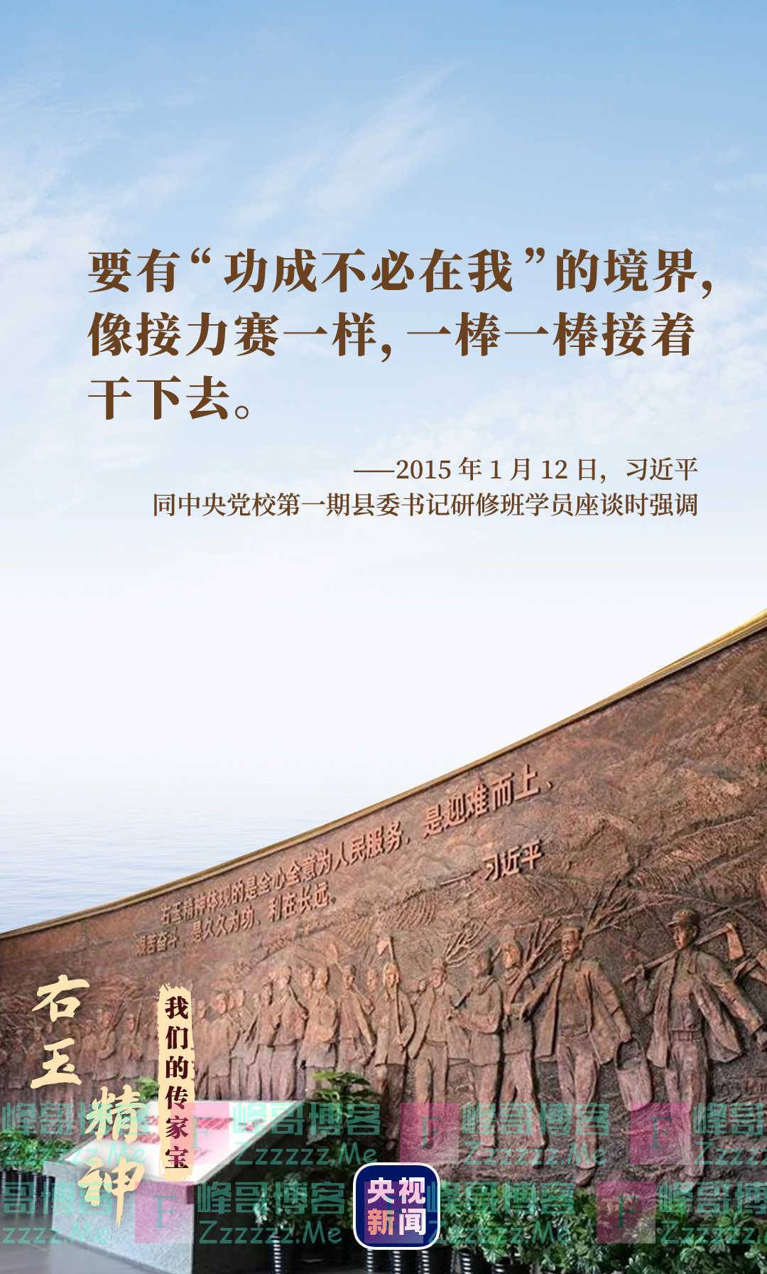 2015年1月,习近平总书记在同中央党校第一期县委书记研修班学员座谈时,讲到了右玉历届县委带领人民群众治沙造林的故事,并要求大家要有“功成不必在我”的境界,像接力赛一样,一棒一棒接着干下去。