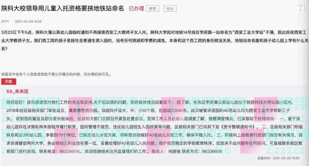 针对西安工业大学教师子女入托问题,西安市未央区教育局在对网友的答复中确认了上述属实。