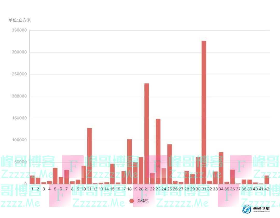 下图为每个类别的储存罐总体积对比图,42类储存罐可累计存储体积为1780397.809立方米。可存贮重量大约178万吨。